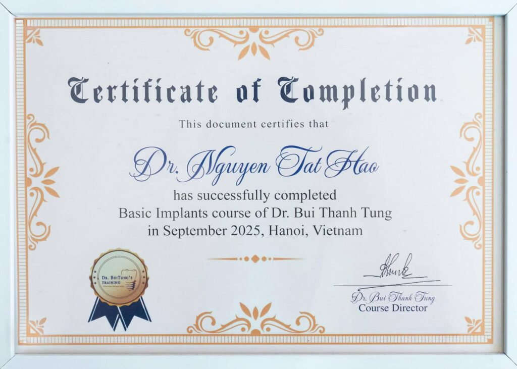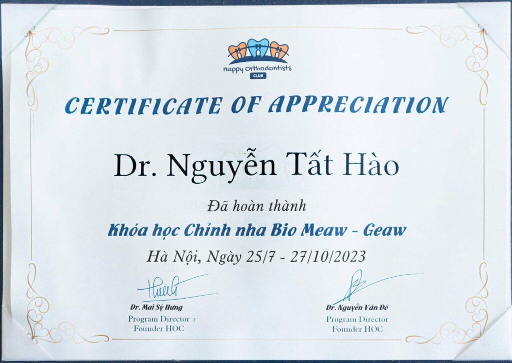 Không ngừng học tập và cập nhật kiến thức mới, bác sĩ Nguyễn Tất Hào luôn xem việc trau dồi chuyên môn là nền tảng để mang đến trải nghiệm điều trị an toàn, thoải mái và hiệu quả hơn cho khách hàng. Tại Nha khoa Cẩm Tú, bác sĩ Hào là một trong những nhân tố quan trọng góp phần xây dựng chất lượng chuyên môn vững chắc trong lĩnh vực chỉnh nha, đồng hành cùng khách hàng trên hành trình kiến tạo nụ cười khỏe mạnh và hài hòa.
